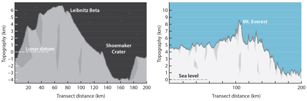 The Moon has a complex and extreme topography, with a maximum elevation point 1.9 km higher than Mount Everest and basins as deep as 9 km. The lunar topography is mainly characterized by an outermost layer of regolith—a fine, sharp, and electrostatically charged soil that covers most part of the underlying bedrock—and craters whose sizes range from micrometers to that of the South Pole-Aitken basin of about 2500 km in diameter—the oldest basin on the Moon and one of the largest known in the Solar System.